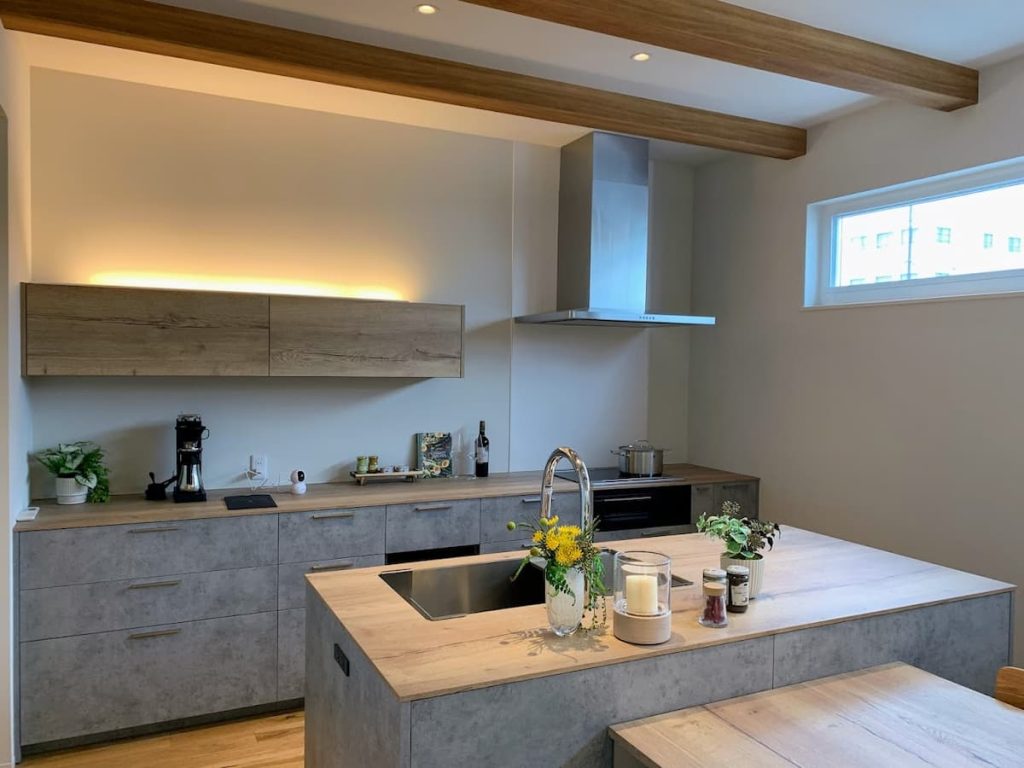 キッチンは木目とグレーの素材感が美しく調和した、スタイリッシュで落ち着いたデザイン。