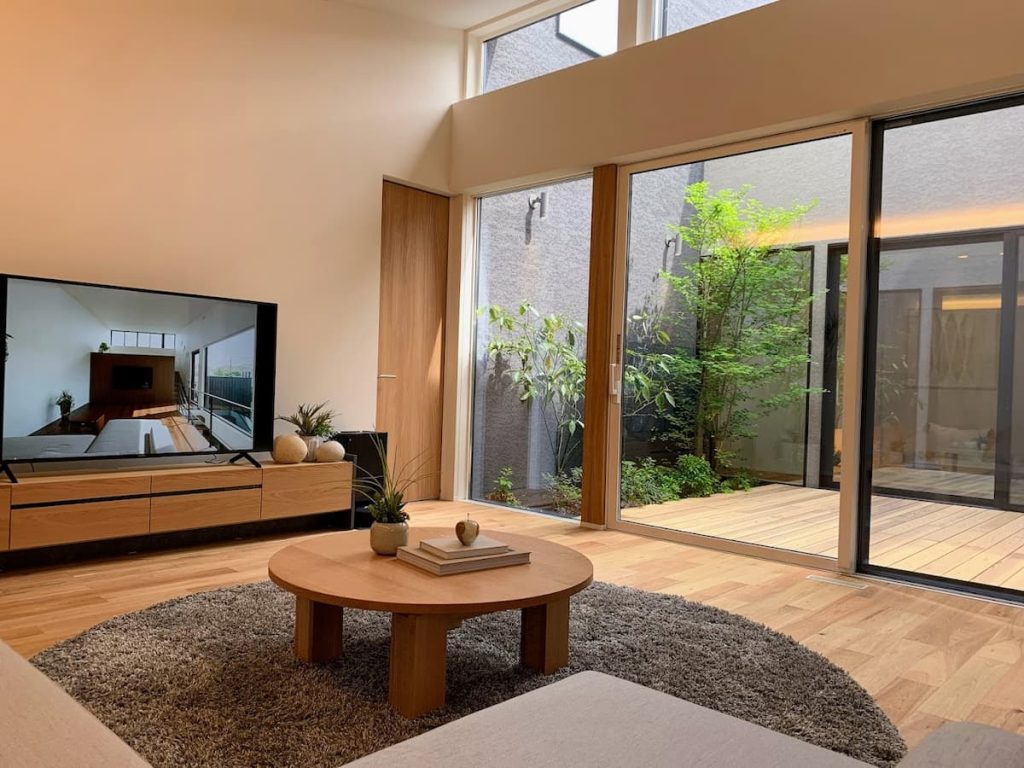 リビングは天井まで届く大きな窓から自然光がたっぷりと差し込み、明るく開放的な空間に仕上がっています。