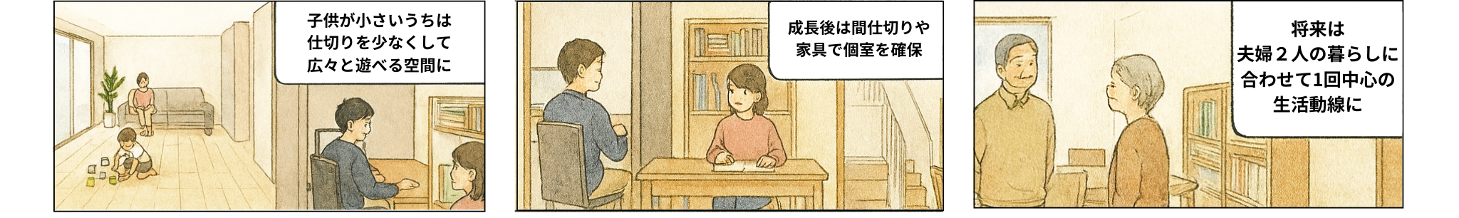 子育て期・独立後・在宅ワーク期など、暮らしの変化に合わせて空間を再構成できる設計が人気です。