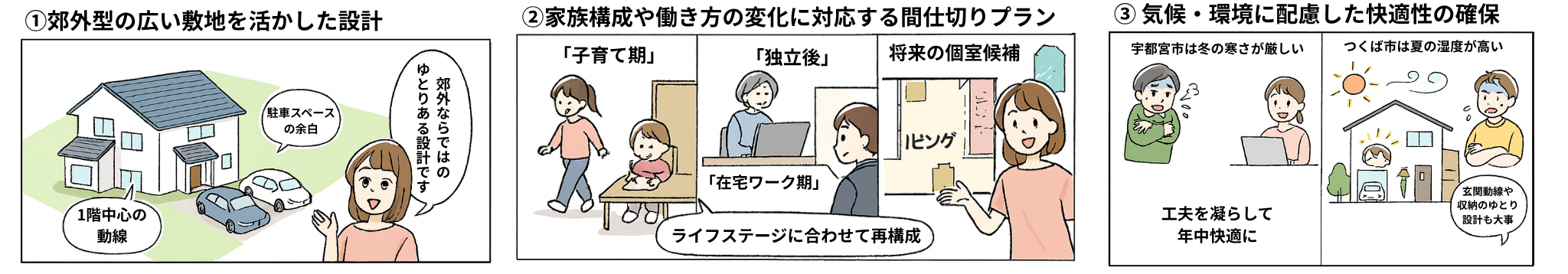 特に栃木県宇都宮市や茨城県つくば市のように、共働き世帯や子育て世代が多く、長く住み続けることを前提にした家づくりが求められる地域では、この「将来を見据えた設計」がとても重要です。