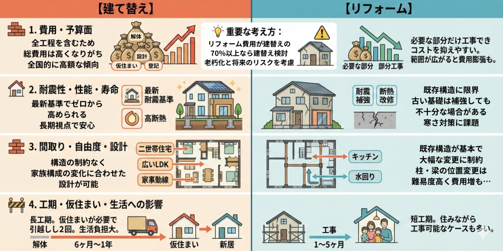 どちらにもメリット・デメリットがあり、住む年数、家の状態、家族の希望、予算によって最適解は変わります。