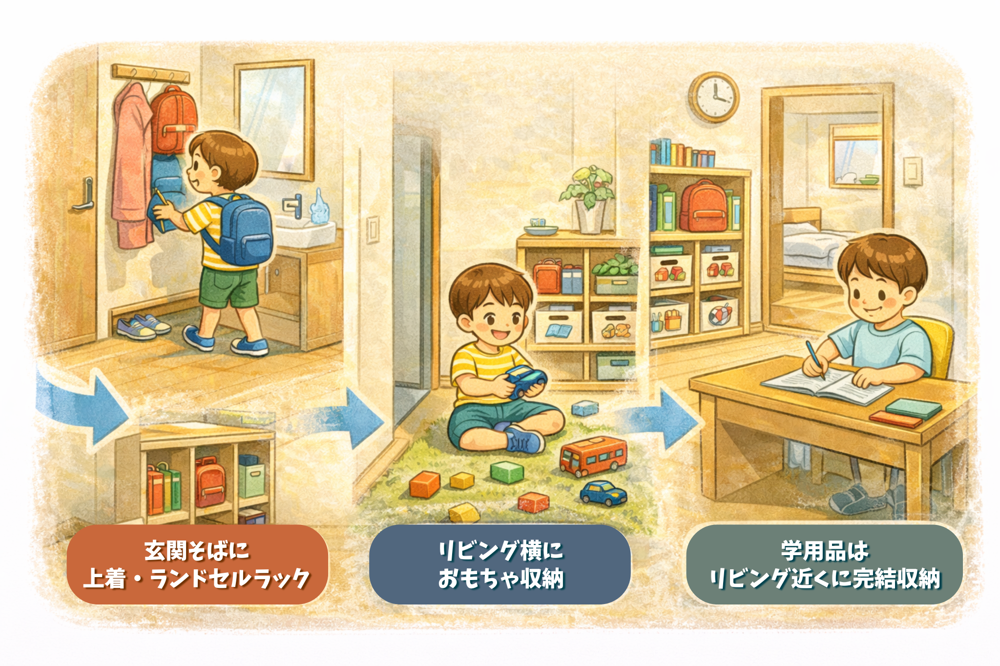 子どもは必ず動くルート(帰宅→手洗い→遊ぶ→勉強→就寝)に沿って収納があると、ワンアクションで片付けが完了するようになります。