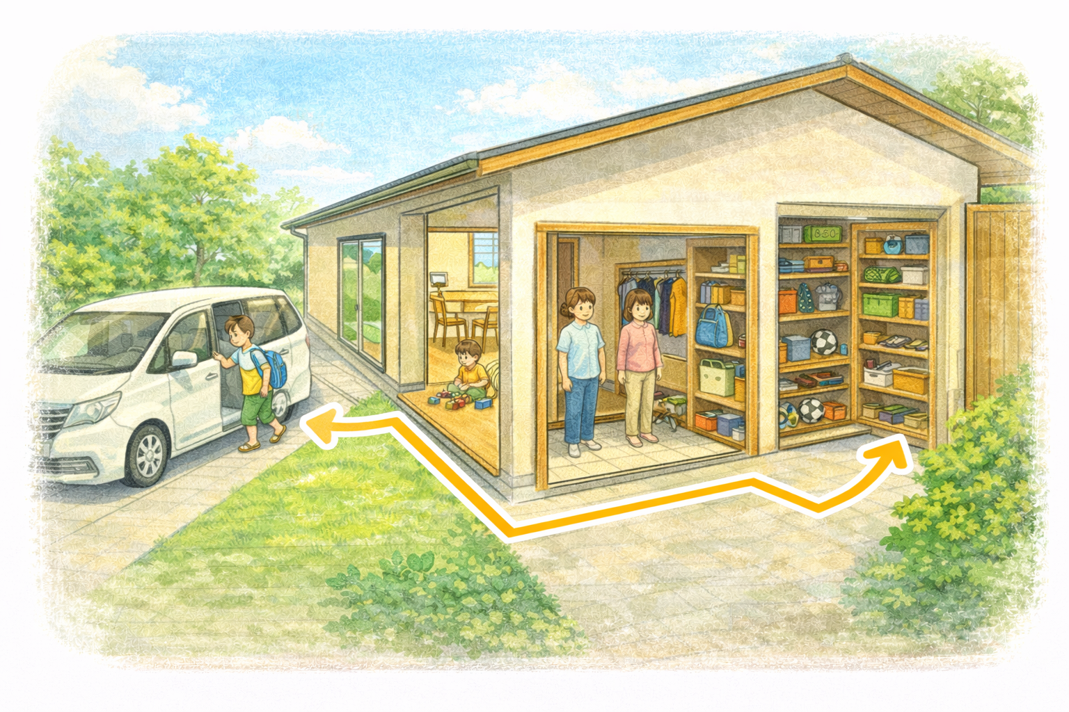 玄関→シューズクローク→手洗い→LDKという流れに収納を組み込むことで、散らかりにくい家になります。