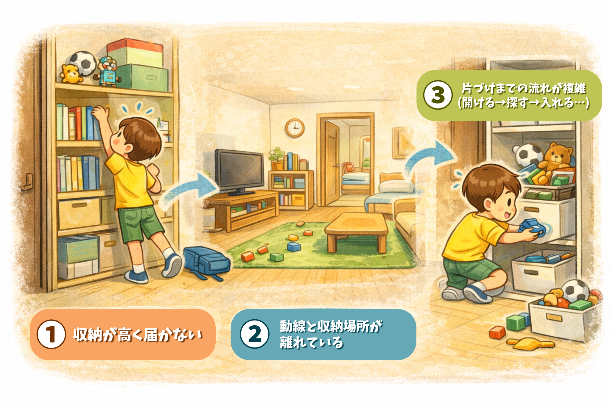 単に「片付けなさい」と言っても効果が出ない理由は、収納が子ども目線・行動動線になっていないからです。