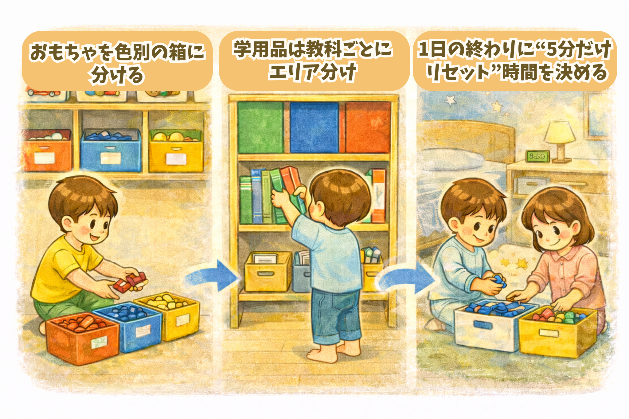 これにより「収納がわかりやすい」「届くから自分でできる」という状態になり、片付けへの抵抗感がぐっと下がります。