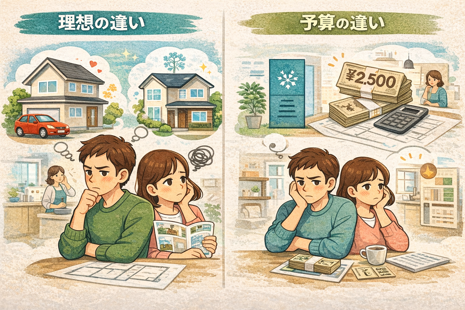 ですが、夫婦の意見が合わないのは決して珍しいことではありません。むしろ、理想の住まいを真剣に考えているからこそ起きるものです。