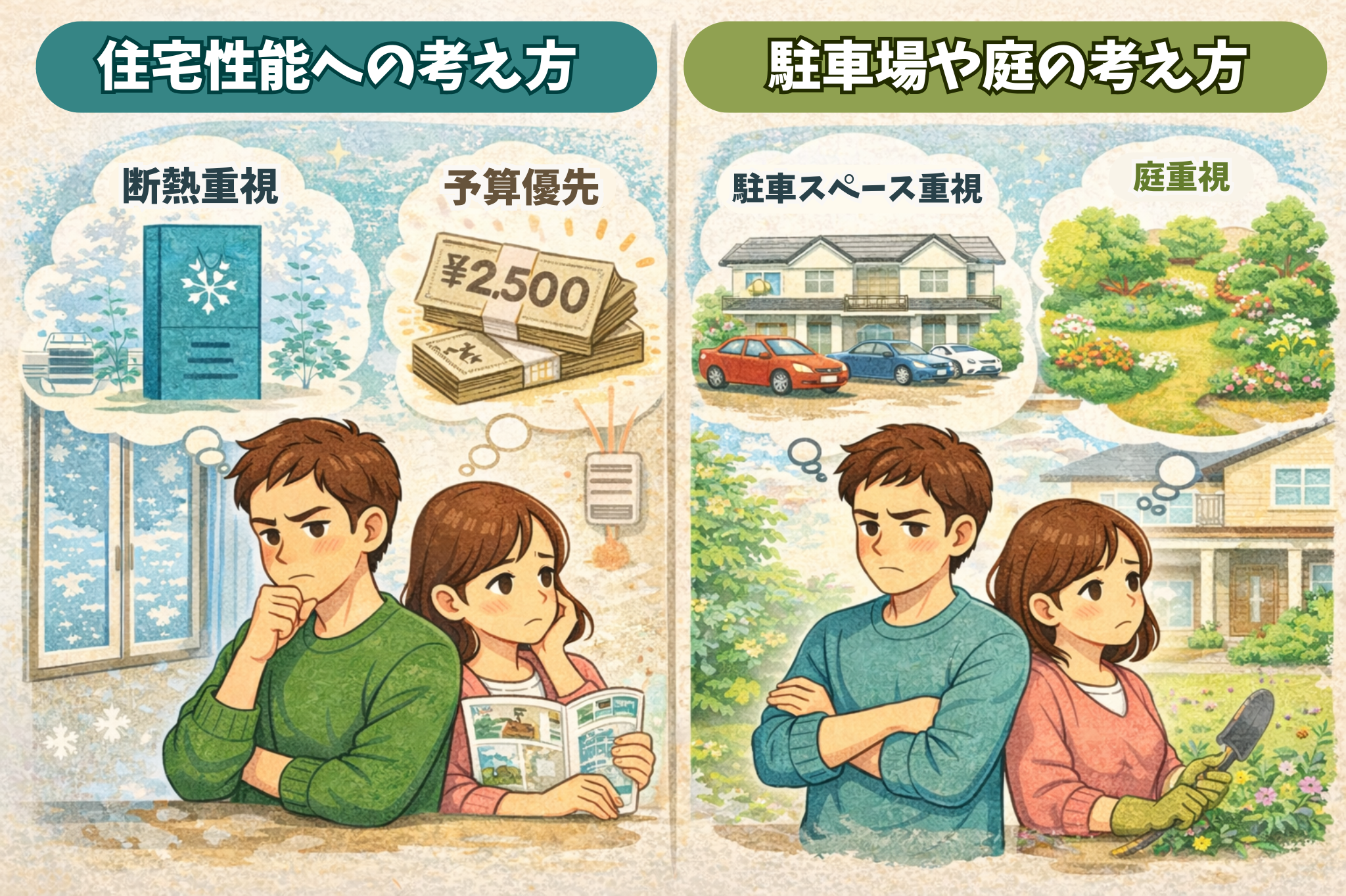 注文住宅では、次のようなポイントで意見が分かれることが多いです。